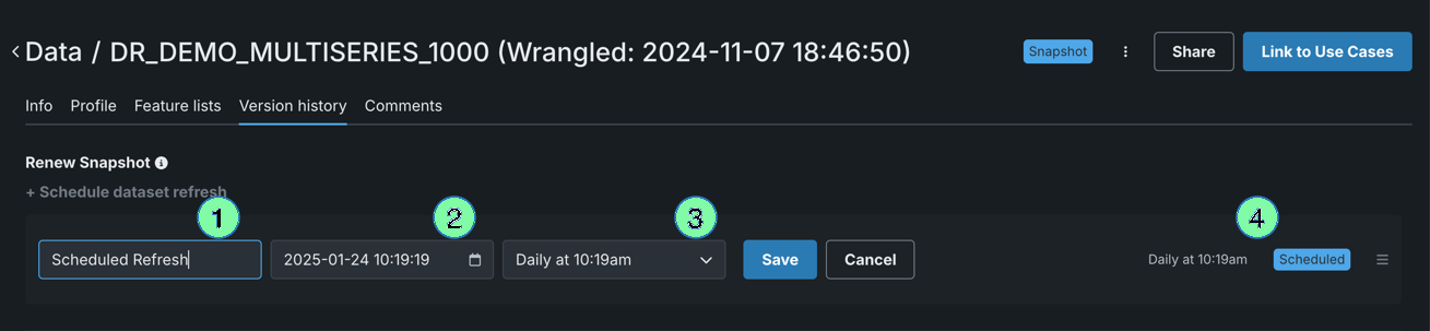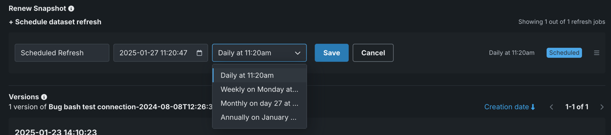 | 1 | + Schedule dataset refresh | Add a scheduled snapshot. |