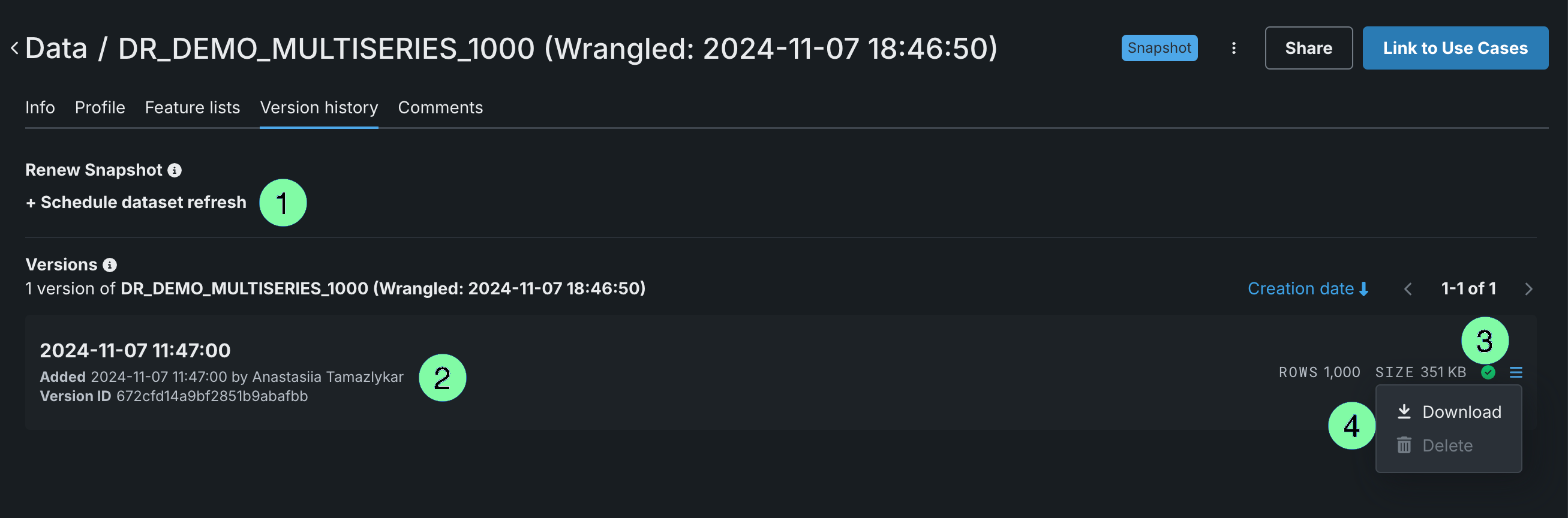 | 4 | Actions menu | Allows you to download or delete the dataset version. |