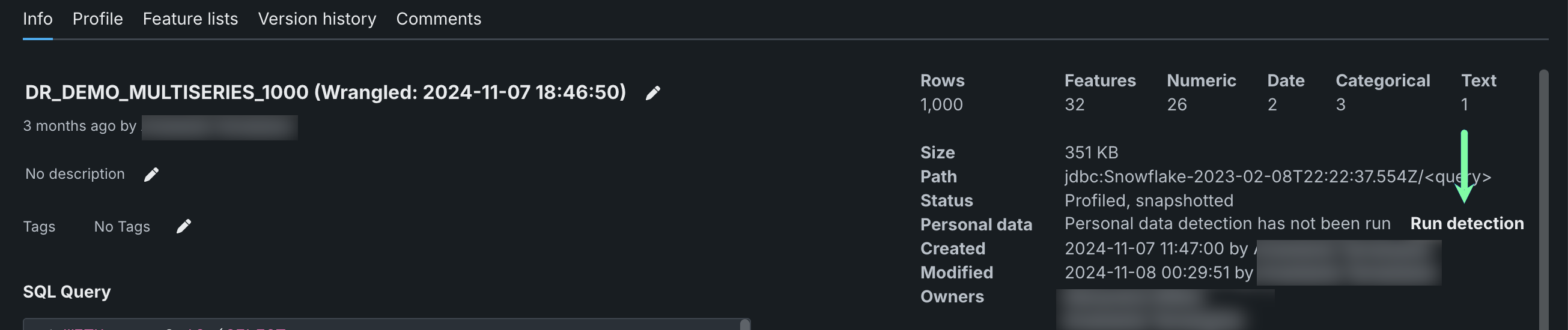 To run personal data detection on a dataset in the Data Registry, go to the Info page click Run Detection.