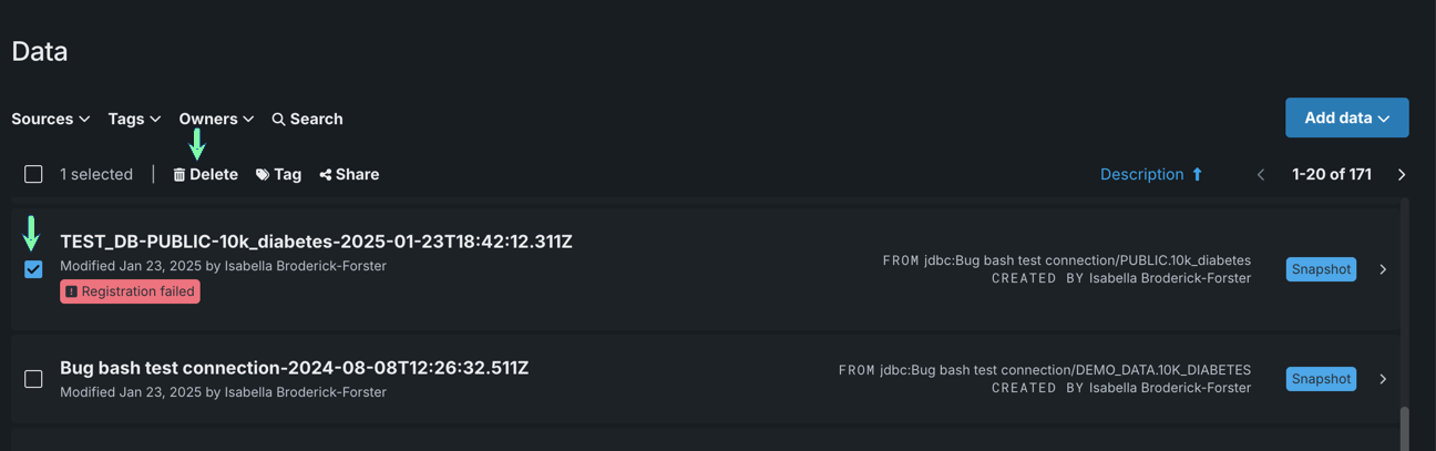 | 3 | Delete | Delete one or more data assets from the Data Registry page. |
