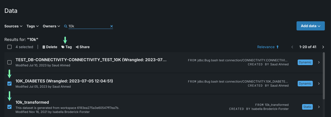 You can apply tags to one or more datasets in the Data Registry page. This is helpful to organize and find datasets in the future. You must have at least write access to the dataset to add a tag.