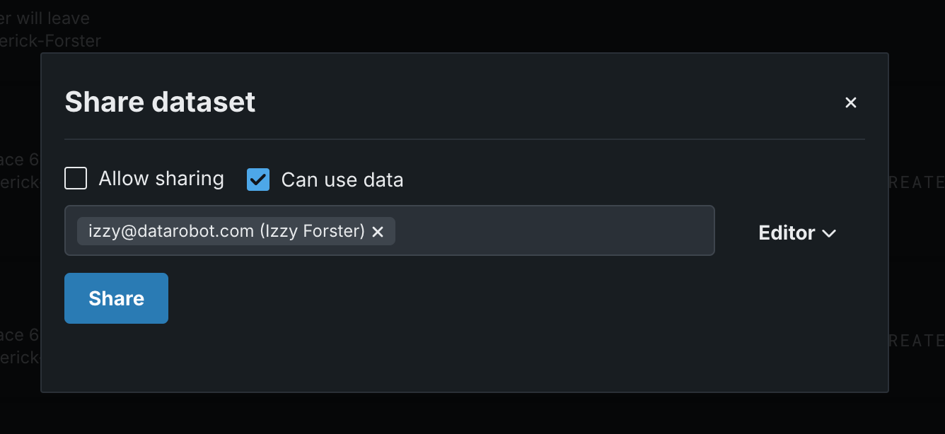 Permission Description Allow sharing If selected, users will also be able to share this dataset. Can use data If selected, the dataset can be wrangled, be used to run experiments , etc. -