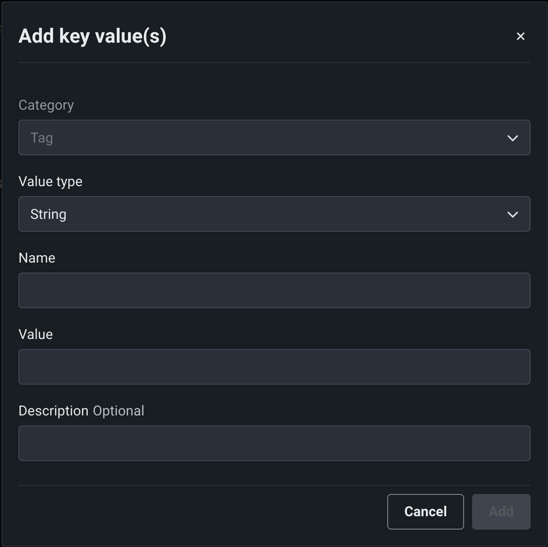 Open the group box for a key values category, click + Add (or, if one or more key values exist for that category, click + Add tag, + Add metric, etc.).
