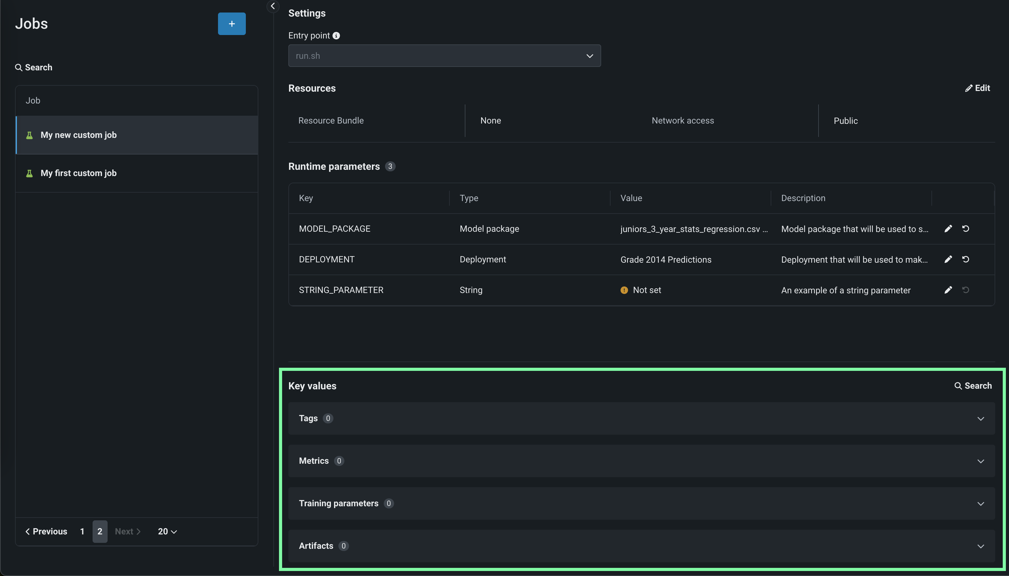 When you create a job, or after running a job, you can create key values from the Assemble tab, or from a run in the Runs tab. In addition, you can edit or delete existing (user-created) key values. For more information on key values, see the documentation.