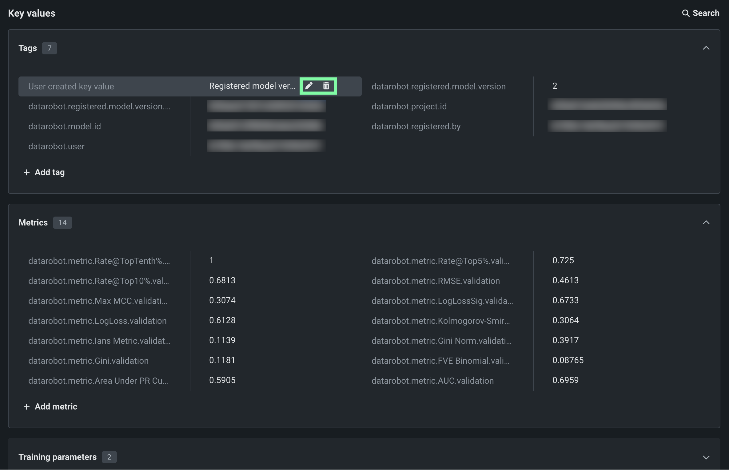 Browse the Tags, Metrics, Training parameters, and Artifacts sections to locate editable key values.