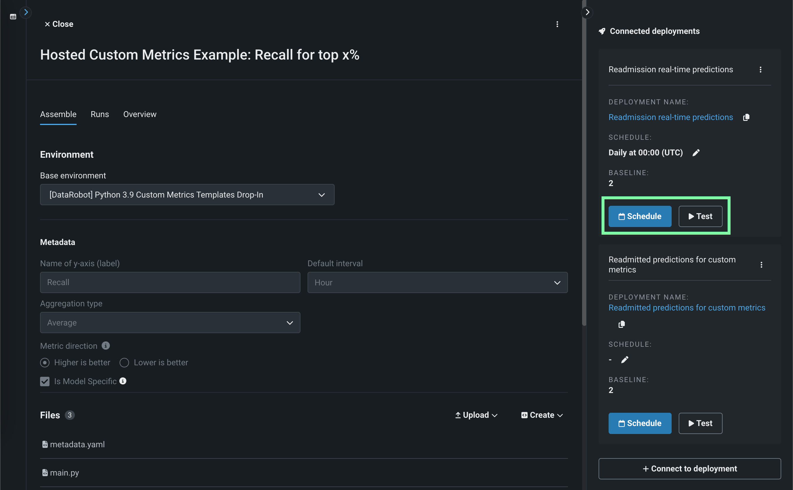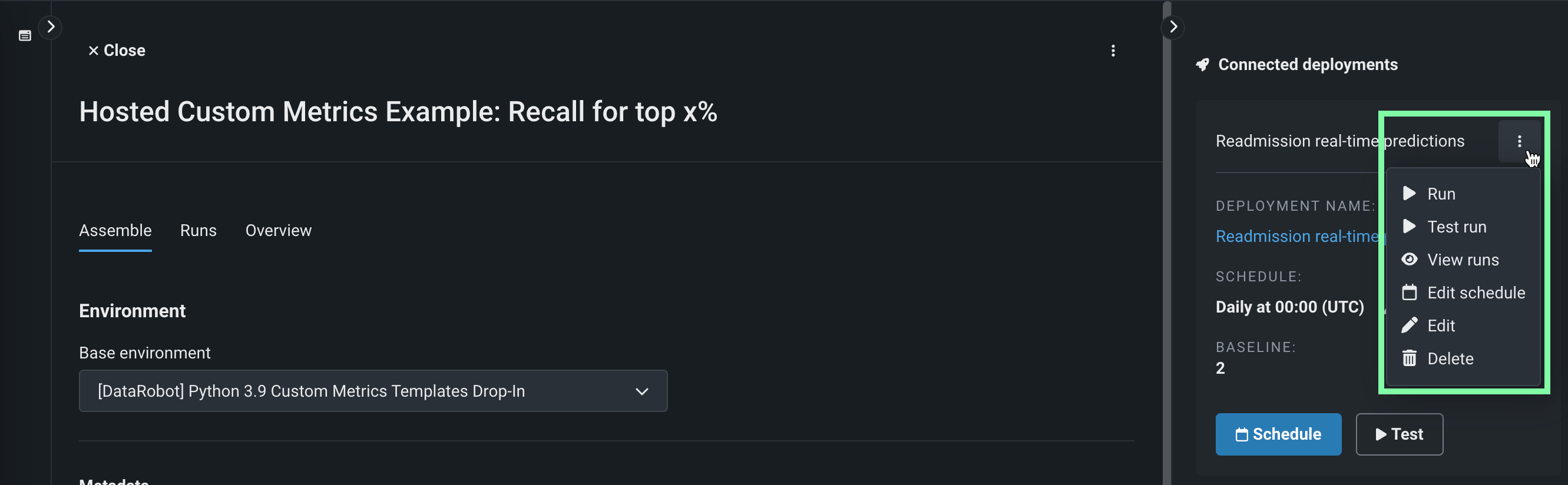 For hosted custom metric jobs created on the Assemble tab or added from the gallery, the run options are governed by Connected deployments, alongside options to edit or delete the connected deployment itself: