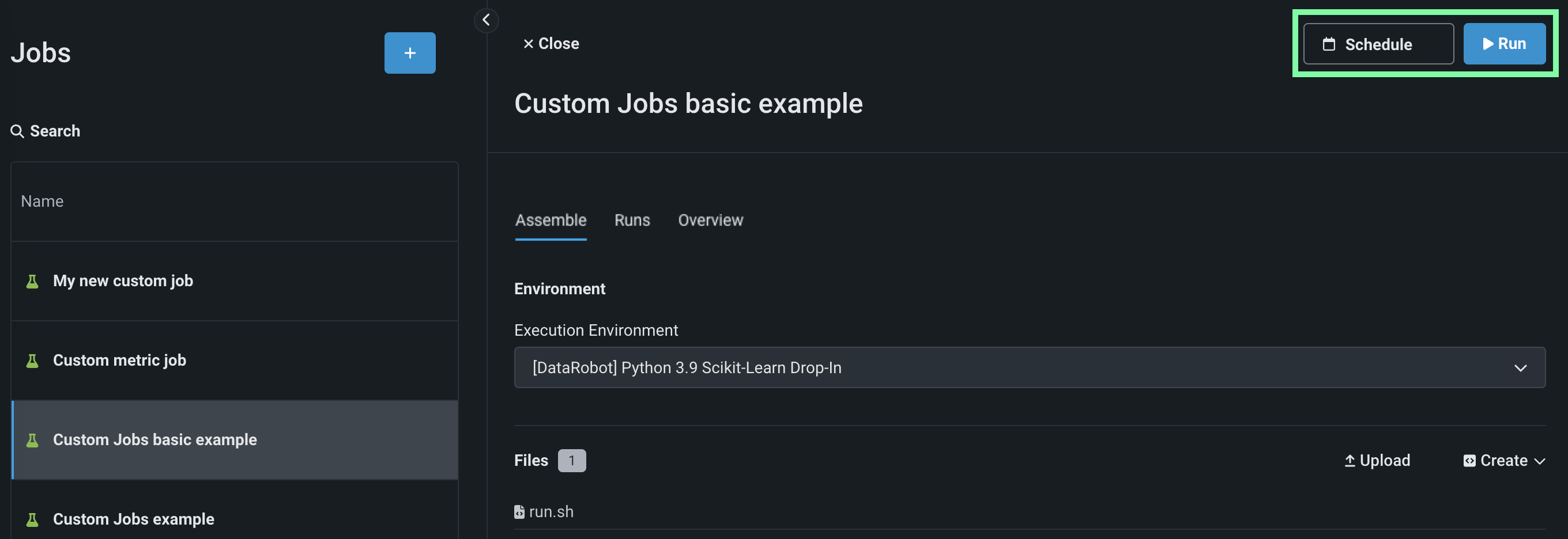 For generic, retraining, and notification jobs, the run options are in the upper-right corner of the custom job panel: