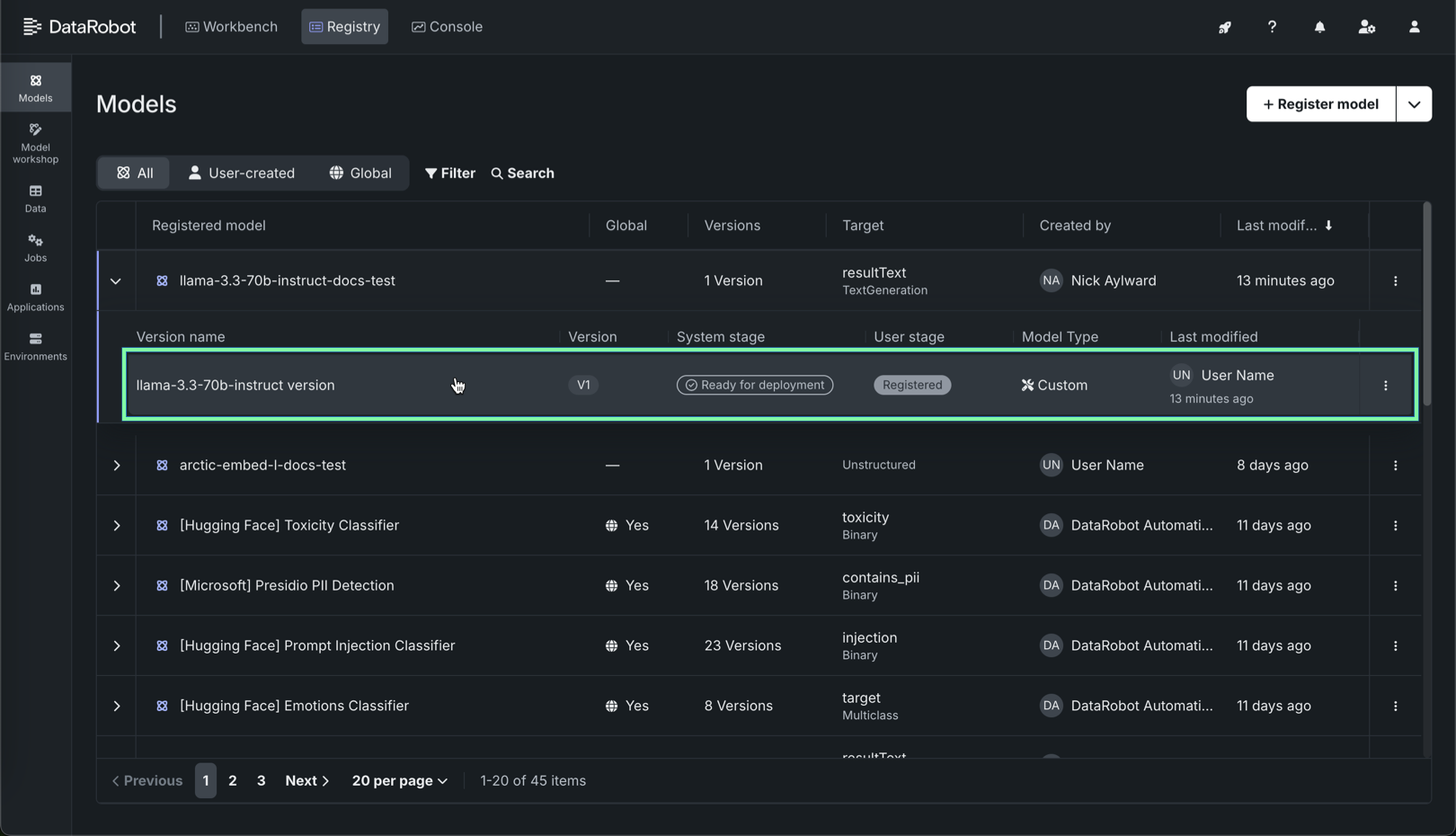 The DataRobot integration with the NVIDIA AI Enterprise Suite enables users to perform one-click deployment of NVIDIA Inference Microservices (NIM) on GPUs in DataRobot Serverless Compute. This process starts in Registry, where you can import NIM containers from the NVIDIA AI Enterprise model catalog. The registered model is optimized for deployment to Console and is compatible with the DataRobot monitoring and governance framework.