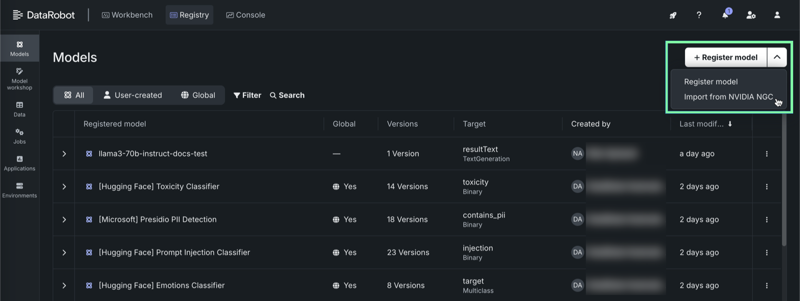 On the Registry > Models tab, next to + Register model, click and then Import from NVIDIA NGC.