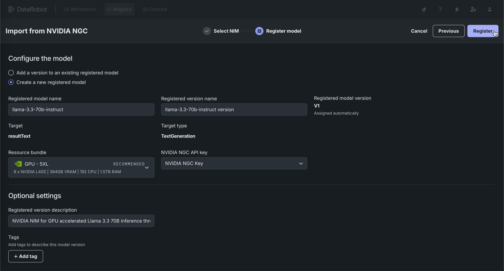 For Managed AI Platform installations, note that the GPU - 5XL resource bundle can be difficult to procure on-demand. If possible, consider a smaller resource bundle.NVIDIA NGC API key Select the credential associated with your NVIDIA NGC API key. Ensure that the selected NVIDIA NGC API key exists in your DataRobot organization, as cross-organization sharing of NVIDIA NGC API keys is unsupported. In addition, due to this restriction, cross-organization sharing of global models created with NVIDIA NIM is unsupported. Optional settings Registered version description Enter a description of the business problem this model package solves, or, more generally, describe the model represented by this version. Tags Click + Add tag and enter a Key and a Value for each key-value pair you want to tag the model version with. Tags added when registering a new model are applied to V1.