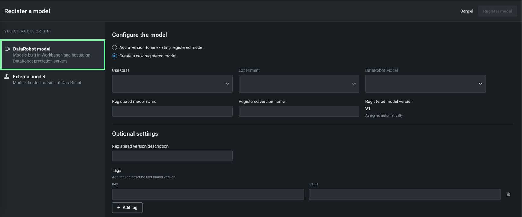 Field Description Use Case Select the Use Case in Workbench containing the model you want to register. Experiment Select the experiment in Workbench containing the model you want to register. DataRobot Model Select the model you want to register. Registered model name / Registered model Do one of the following: - Registered model name: When registering a new model, enter a unique and descriptive name for the new registered model. If you choose a name that exists anywhere within your organization, a warning appears.