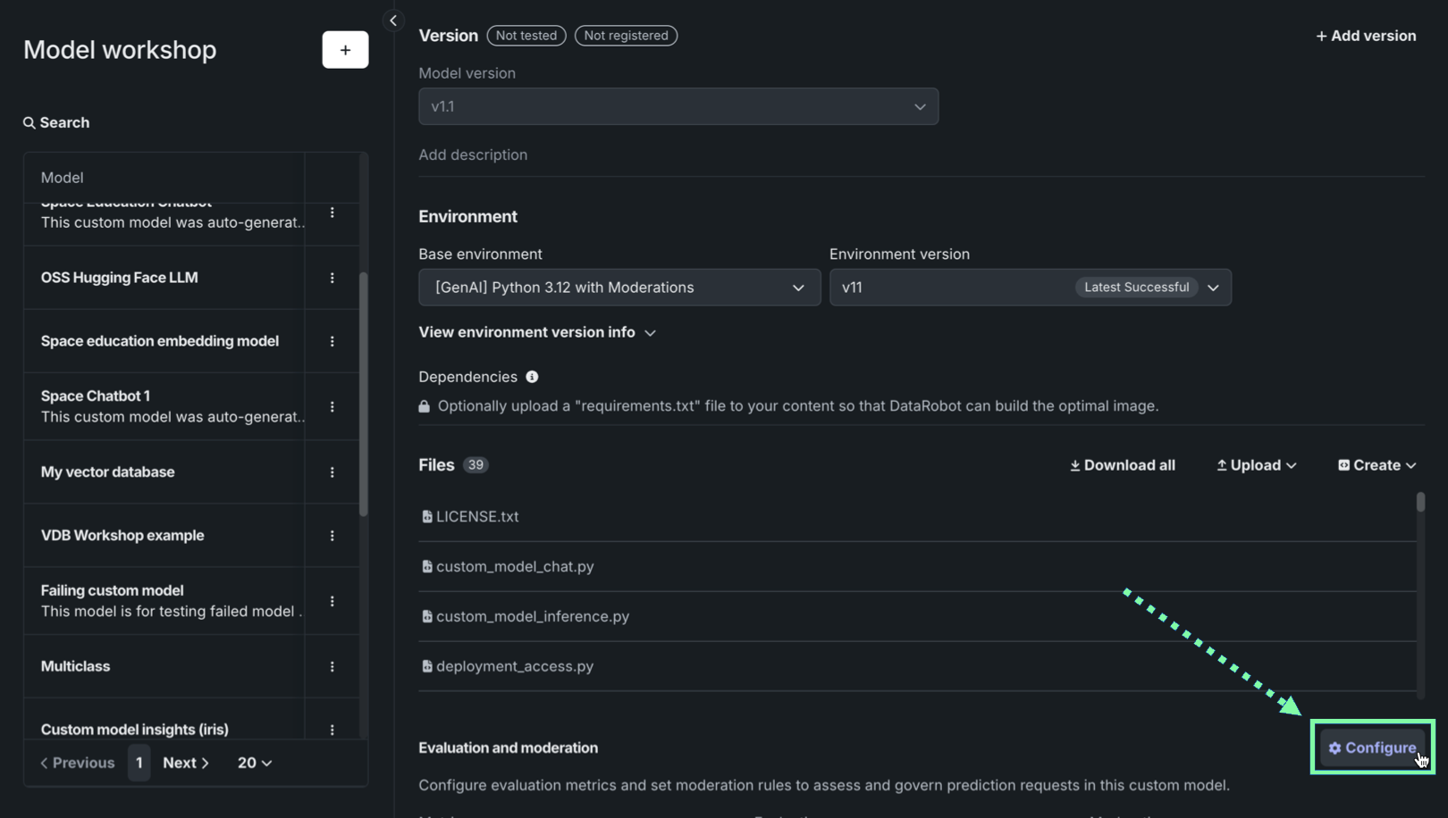 After you've configured the custom model's required settings, navigate to the Evaluation and moderation section and click Configure: