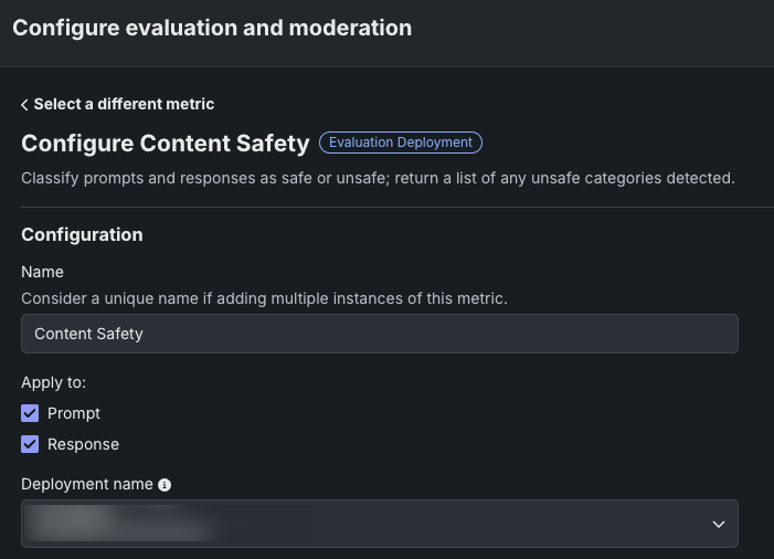 In the Moderation section, with Configure and apply moderation enabled, for each evaluation metric, set the following: