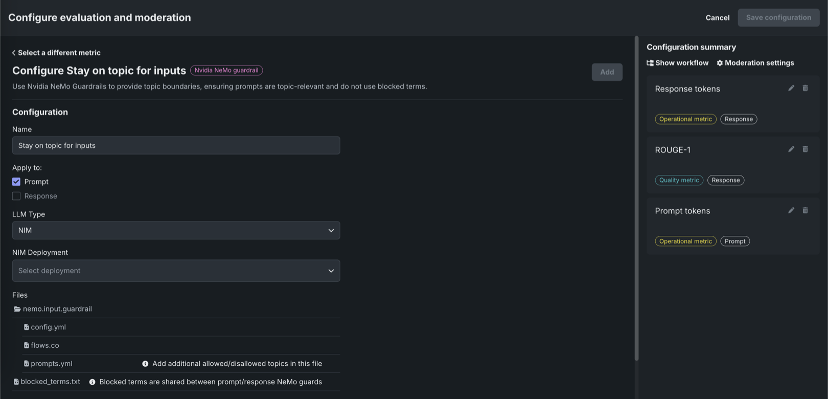 Field Description Name Enter a descriptive name for the metric you're configuring. Apply for Stay on topic for input is applied to the prompt. Stay on topic for output is applied to the response. LLM type Set the LLM type to NIM. NIM Deployment Select an NVIDIA NIM deployment. For more information, see Import and deploy with NVIDIA NIM. Credentials Select a DataRobot API key from the list. Credentials are defined on the Credentials management page. Files (Optional) Configure the NeMo files. Next to a file, click to modify the NeMo guardrails configuration files. In particular, update prompts.ymlwith allowed and blocked topics andblocked_terms.txtwith the blocked terms, providing rules for NeMo guardrails to enforce. Theblocked_terms.txtfile is shared between the input and output stay on topic metrics; therefore, modifyingblocked_terms.txtin the input metric modifies it for the output metric and vice versa. Only two NeMo stay on topic metrics can exist in a custom model, one for input and one for output.Field Description Name Enter a descriptive name for the metric you're configuring. Apply for Apply content safety to both the prompt and the response. Deployment name In the list, locate the name of the llama-3.1-nemoguard-8b-content-safety model registered and deployed in DataRobot and click the deployment name. Field Description Name Enter a descriptive name for the metric you're configuring. Apply for Apply jailbreak to the prompt. Deployment name In the list, locate the name of the nemoguard-jailbreak-detect model registered and deployed in DataRobot and click the deployment name. -