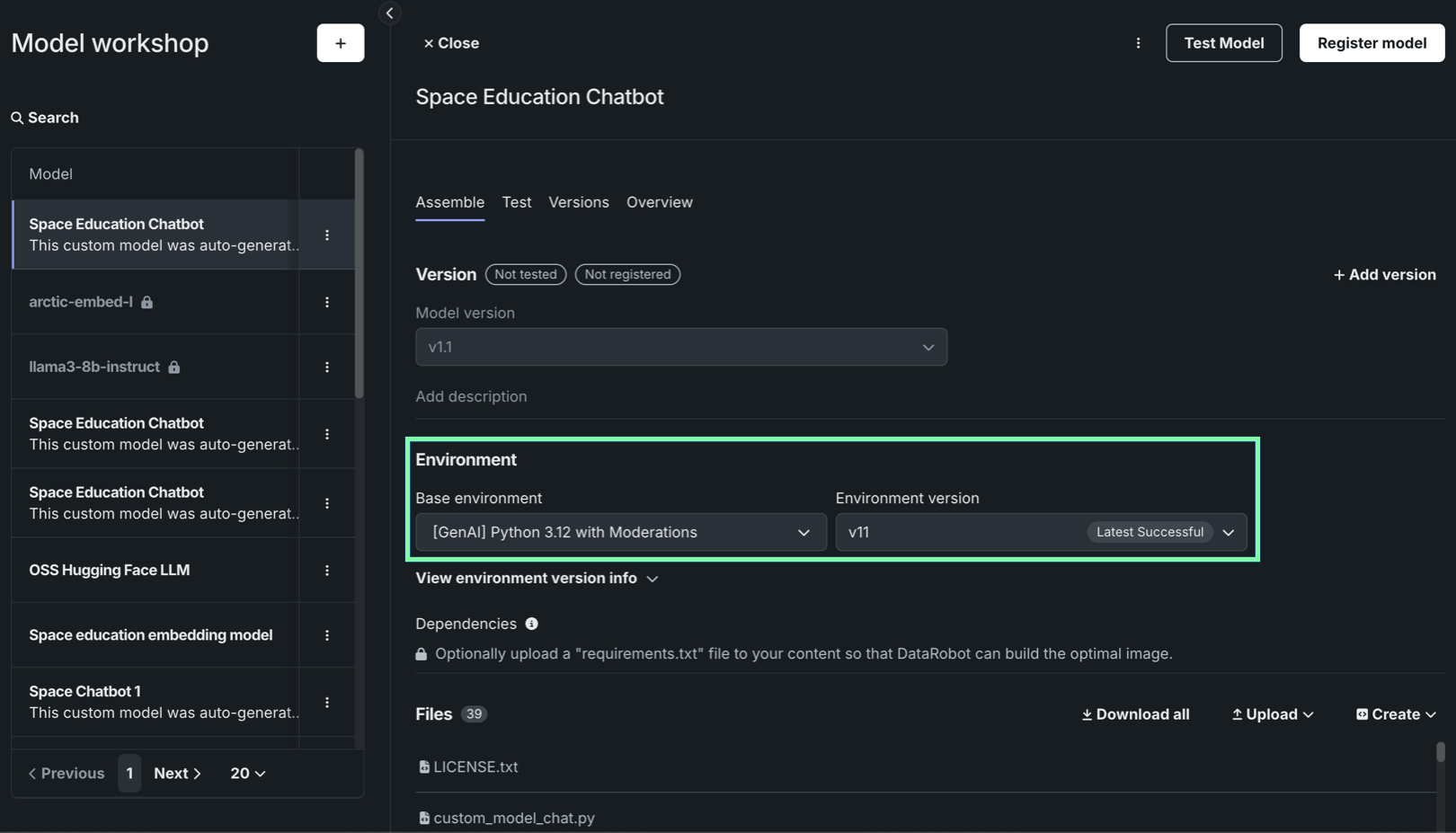 When you assemble a text generation model with moderations, ensure you configure any required runtime parameters (for example, credentials) or resource settings (for example, public network access). Finally, set the Base environment to a moderation-compatible environment, such as [GenAI] Python 3.12 with Moderations: