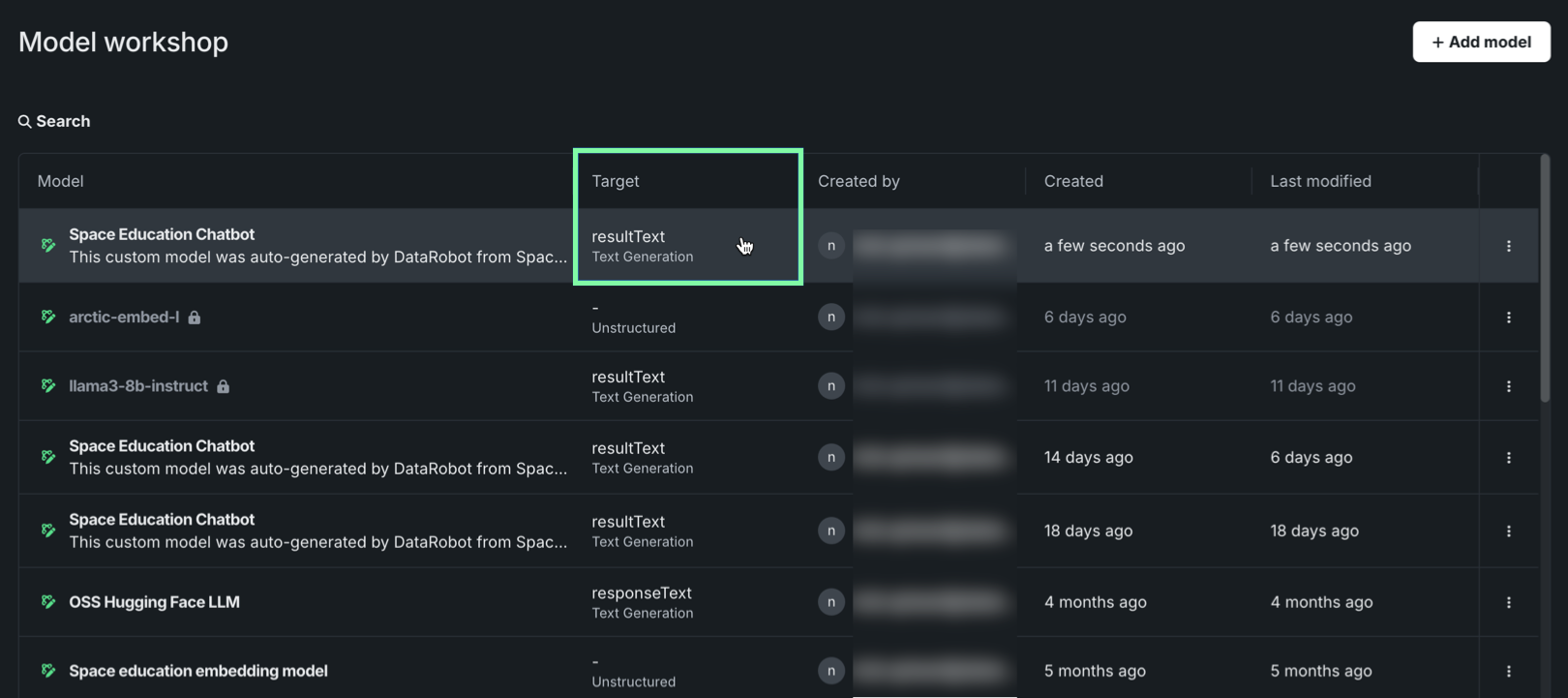In the Workshop, open the Assemble tab of a custom model with the Text Generation target type and assemble a model, either manually from a custom model you created outside DataRobot or automatically from a model built in a Use Case's LLM playground.