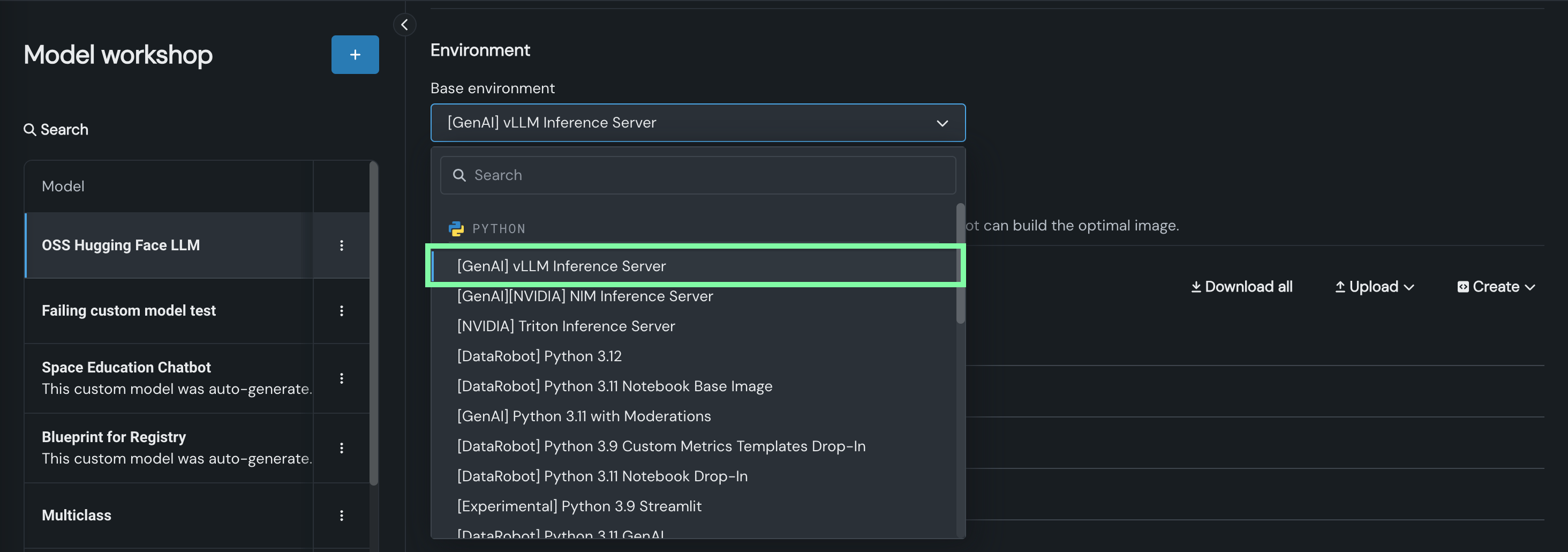 If the GenAI vLLM Inference Server environment isn't available in the Base environment list, you can add a custom environment using the resources provided in the DRUM repository's public_dropin_gpu_environments/vllm directory.