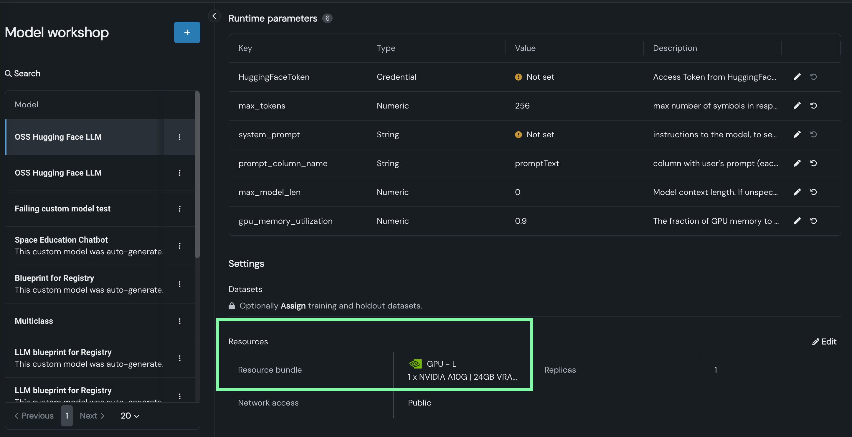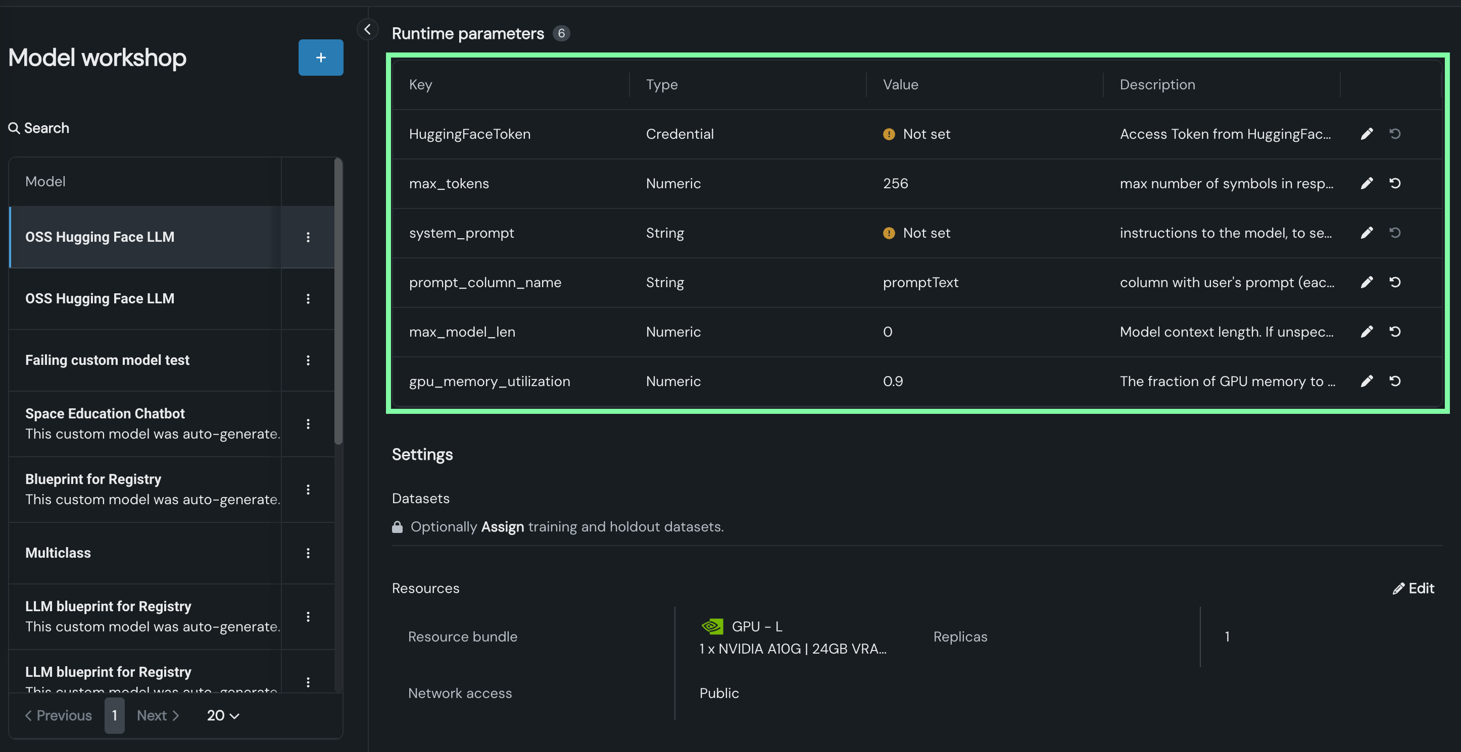 Use the workshop to create and deploy popular open source LLMs from the Hugging Face Hub, securing your AI apps with enterprise-grade GenAI observability and governance in DataRobot. The new [GenAI] vLLM Inference Server execution environment and vLLM Inference Server Text Generation Template provide out-the-box integration with the GenAI monitoring capabilities and Bolt-on Governance API provided by DataRobot.