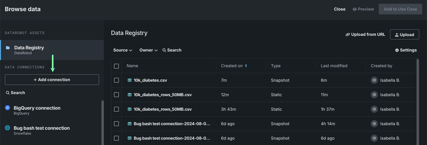 In Workbench, you can easily configure and reuse secure connections to predefined data sources. Not only does this allow you to interactively browse, preview, and profile your data, but for supported connections, it also allows you to use DataRobot's integrated data preparation capabilities.
