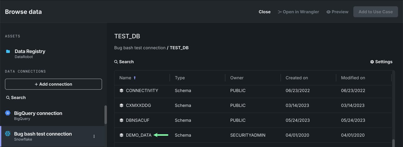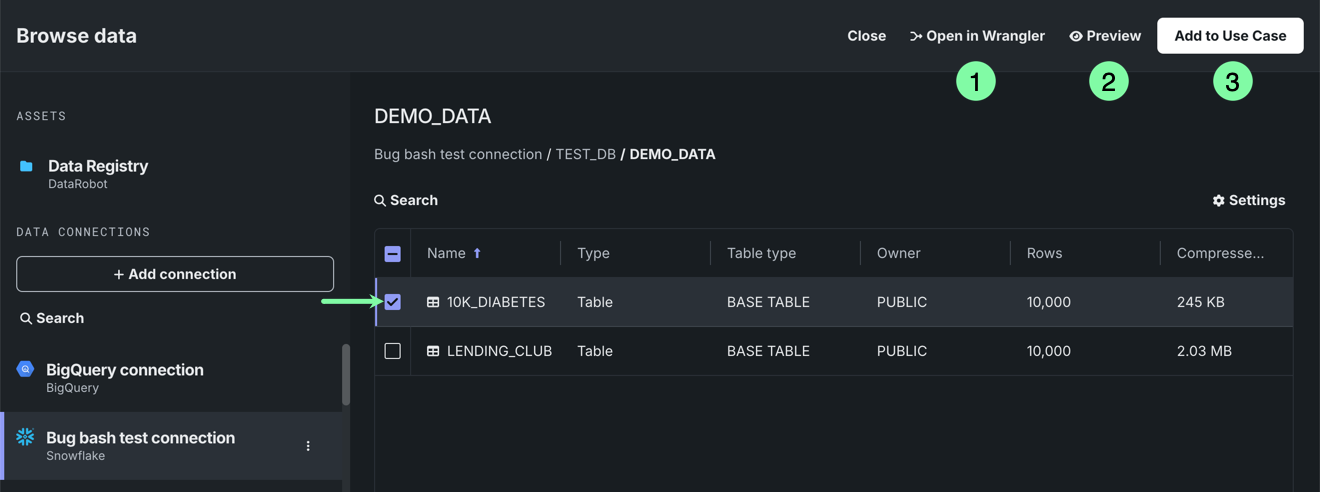 Description 1 Click Open in Wrangler to prepare the dataset before adding it to your Use Case. 2 Click Preview to open a snapshot preview to help determine if the dataset is relevant to your Use Case and/or if it needs to be wrangled. 3 Click Add to Use Case to add it to your Use Case, making it available to you and other team members on the Data tab. Large datasets