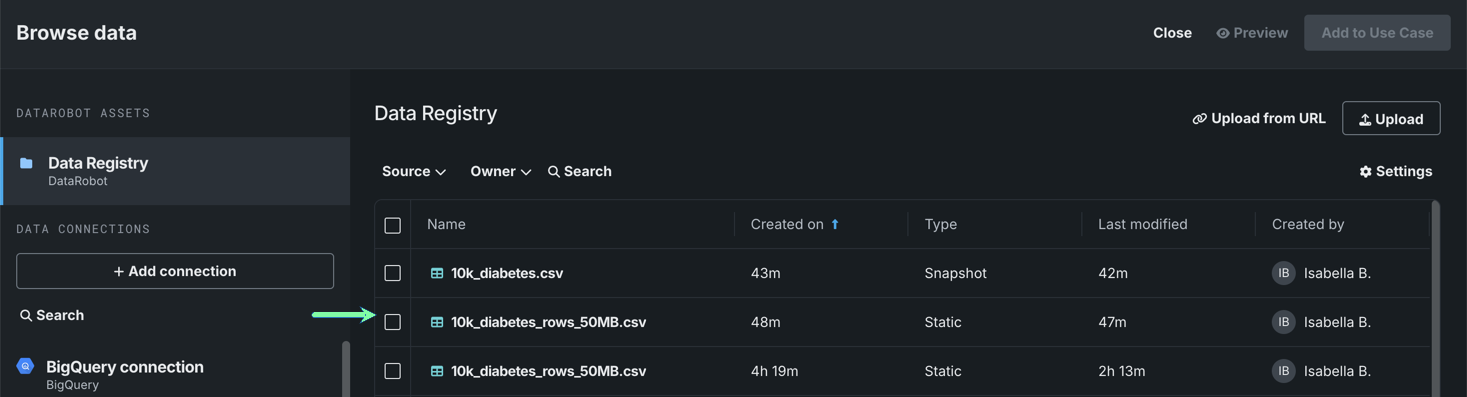 When you open the Browse data modal, DataRobot displays the Data Registry, a central catalog for your datasets that lists all static, snapshot, and dynamic datasets currently in the Data tile in Registry—this includes data that has been added directly to the Data Registry or added to a Use Case, which is then registered in the Data Registry.