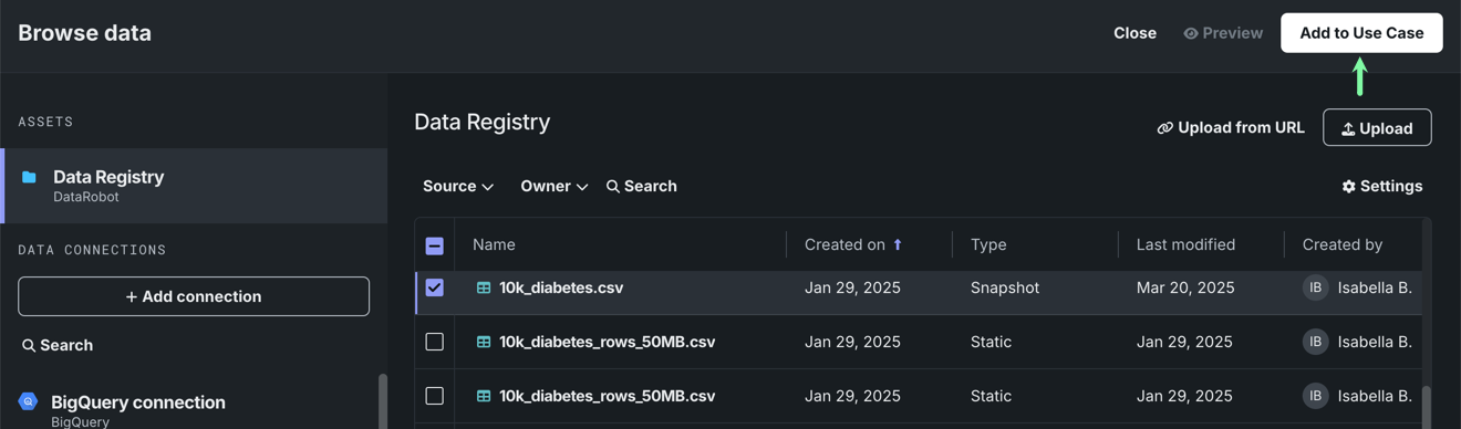 - Add the dataset to your Use Case by clicking Add to Use Case.