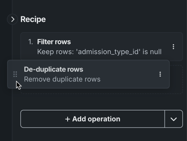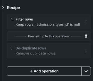 In the right panel, either click + Add operation to add individual transformations to your recipe, or Import recipe to import an existing recipe.