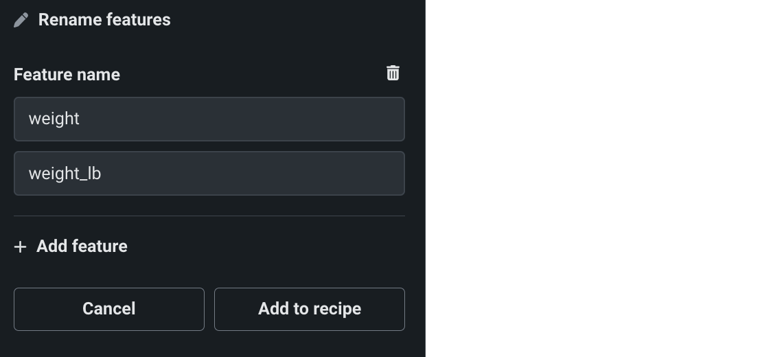 Under Feature name, click inside the first field and choose the feature you want to rename. Then, enter the new feature name in the second field.