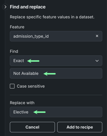 Use the Find and replace operation to quickly replace specific feature values in a dataset. This is helpful to, for example, fix typos in a dataset.