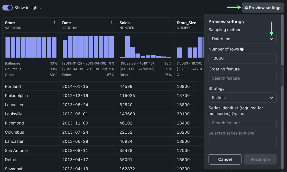 To configure date/time sampling, open Preview settings and set the Sampling method to date/time.