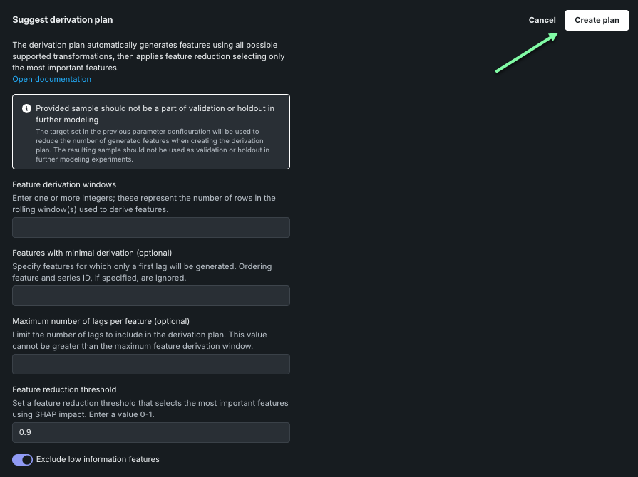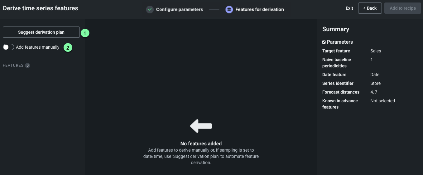 | 1 | Suggest derivation plan | Have DataRobot suggest a derivation plan and automatically create new features. | Requires date/time |
