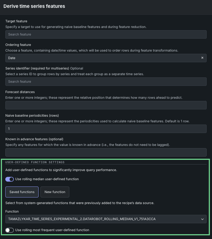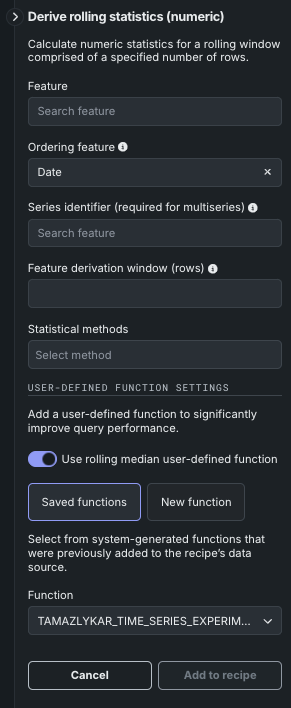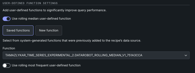 When using median statistics (for numeric features) or most frequent statistics (for categorical features), UDFs are essential to improving query performance and DataRobot recommends using them when wrangling with time series operations. They generate SQL that is smaller and faster, without needing additional joins to create windows. Create functions, either DataRobot-generated or linked via URL, and they will be added to the recipe’s data store. Or, store and re-use them. SQL scripts with functions are available on GitHub. The scripts include UDFs/aggregations that compute rolling median and most frequent statistics for different databases.