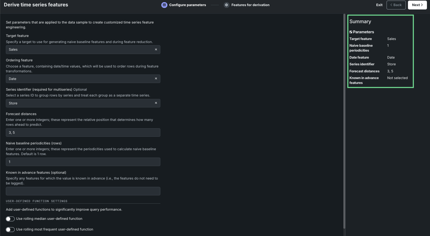 | Lag features | Sets the time periods in the past to create features from, adding one or more features to the dataset. |