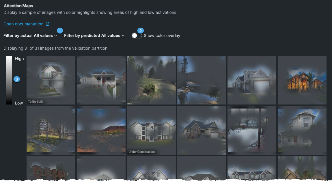 Select the option that provides the clearest contrast. For example, for black and white datasets, the alternative color overlay may make attention areas more obvious (instead of using a black-to-transparent scale). Toggle Show color overlay to compare.