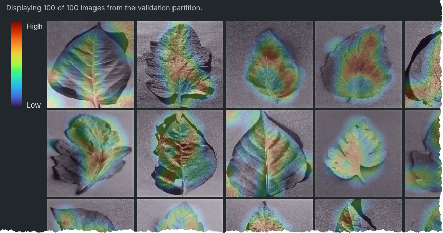 An attention map can indicate whether your model is looking at the foreground or background of an image or whether it is focusing on the right areas. For example, is it looking only at “healthy” areas of a plant when there is disease and because it does not use the whole leaf, classifying it as "no disease"? Is there a problem with overfitting or target leakage? These maps help to determine whether the model would be more effective if the augmentation settings were tuned.