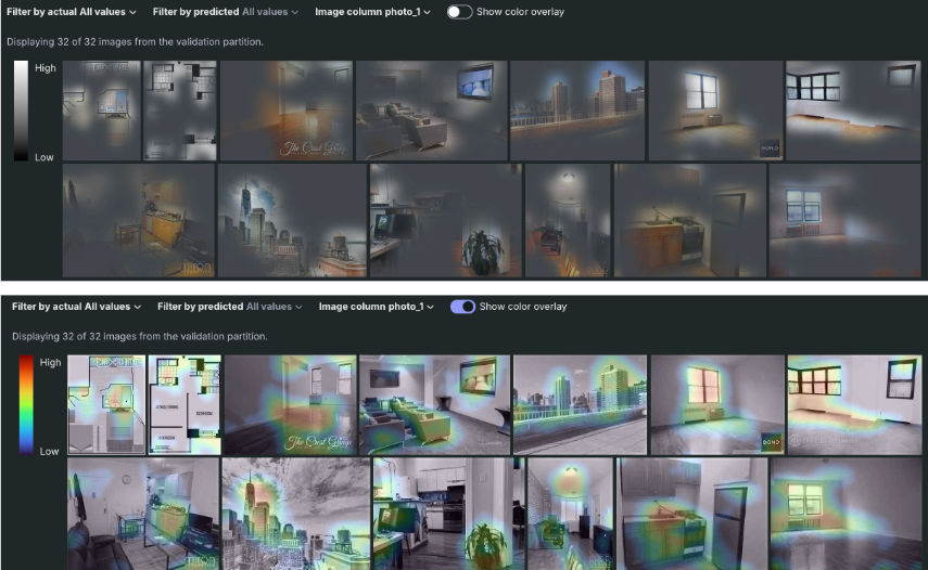 Use this option to check whether the model is working as expected—is it using the 'right' areas of the image to make a prediction or is it focusing on random areas that don't fit the use case? This insight can be thought of as the image equivalent of feature importance in tabular datasets.