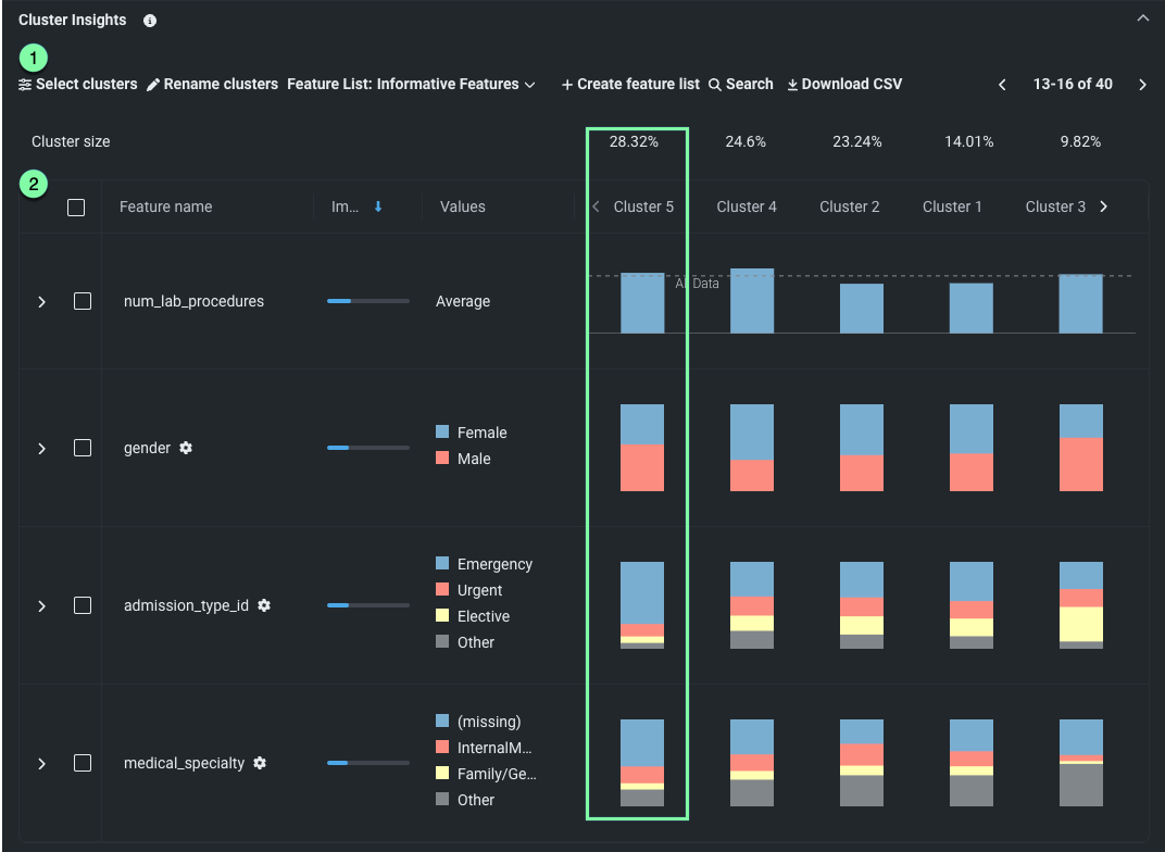 | 2 | Clusters and features | Provides cluster and feature details, including visualizing cluster breakdown by feature and listing features, sorted by feature importance. The Informative Feature list displays by default; use the Feature list dropdown in the controls to change the display. |