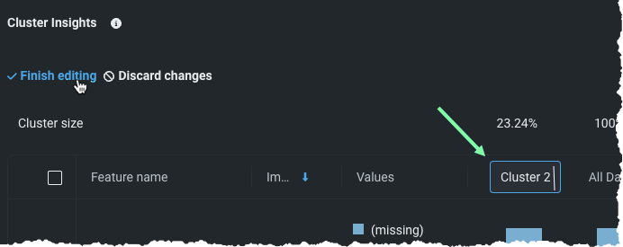 You can rename clusters after you gain an understanding of what they represent. The cluster names propagate to other insights and predictions, allowing you to further analyze the clusters. Click Rename clusters, edit cluster names, and click Finish editing when done.