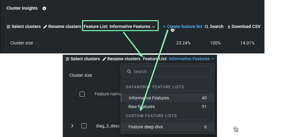 By default, DataRobot builds clustering models using the Informative Features list. Select another feature list, either automatically generated or custom, to explore a different subset of features. Changing the list does not impact the model, only the display; however, analyzing the features not used to generate the clusters can still be useful to answer questions like "How does income distribute among my clusters, even if I'm not using it for clustering?"