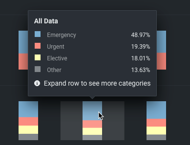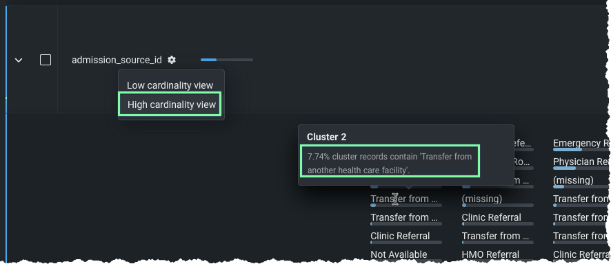 To drill into all categories, click the gear :fontawesome-gear: next to the feature name and select High cardinality. Hover on a value how many records in the selected cluster contain that value.