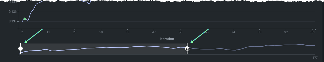 When there are more than 100 iterations, a preview is shown below the learning curve chart. The preview controls which 100 iterations to display. Once the preview chart becomes available, it also updates as training continues. Use the handles on the preview to drag the window and change the view.