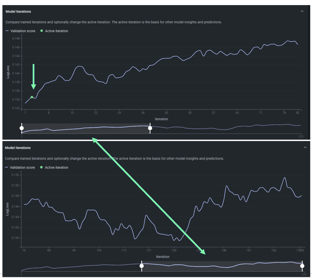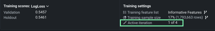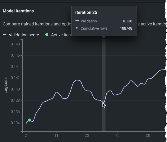The Model Iterations insight provides a learning curve to help visualize the validation score for each iteration. Validation score is the basis of the active iteration selection. The chart shows all trained iterations and, when iteration training is in progress, updates in real time so that you can monitor training progress on each chunk. Hover on any point in the curve to see the validation score and cumulative rows for that iteration.