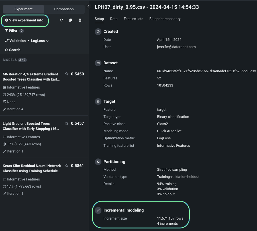 Click View experiment info to view details of the built experiment, including total rows and iterations: