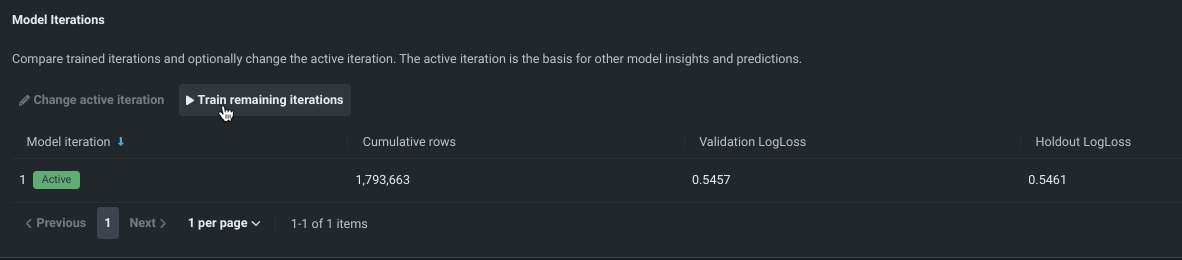 For models with more than one iteration run, the most accurate iteration is marked with an Active badge. For a selected model, click Change active iteration to select a different iteration: