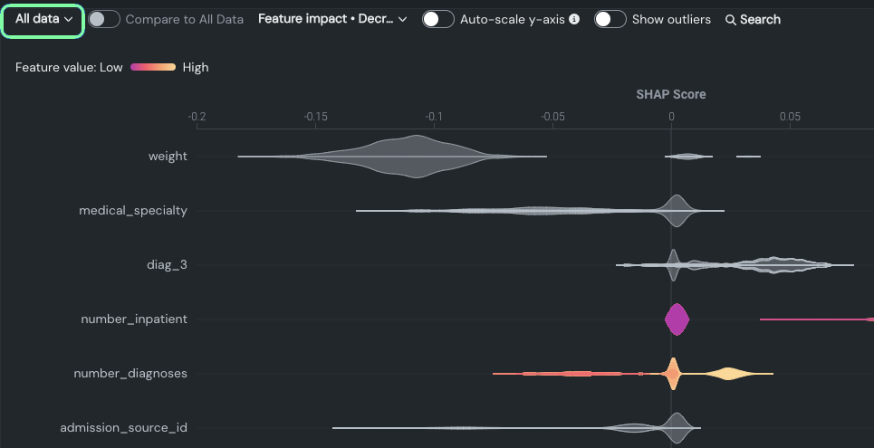 | SHAP Distributions: Per Feature (this page) | Shows the distribution and density of scores per feature using a violin plot for the visualization. |