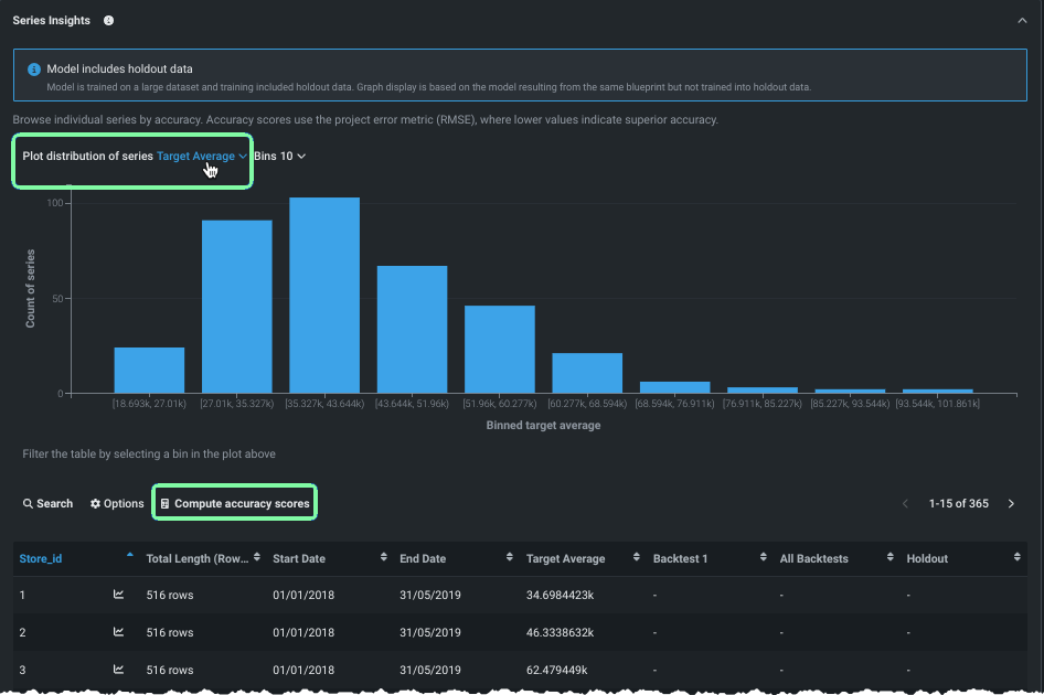 To speed processing, Series Insights visualizations are initially computed for the first 1000 series (sorted by ID). You can, however, Compute accuracy scores for the remaining series data. Use the Plot distribution controls and binning to change the display.