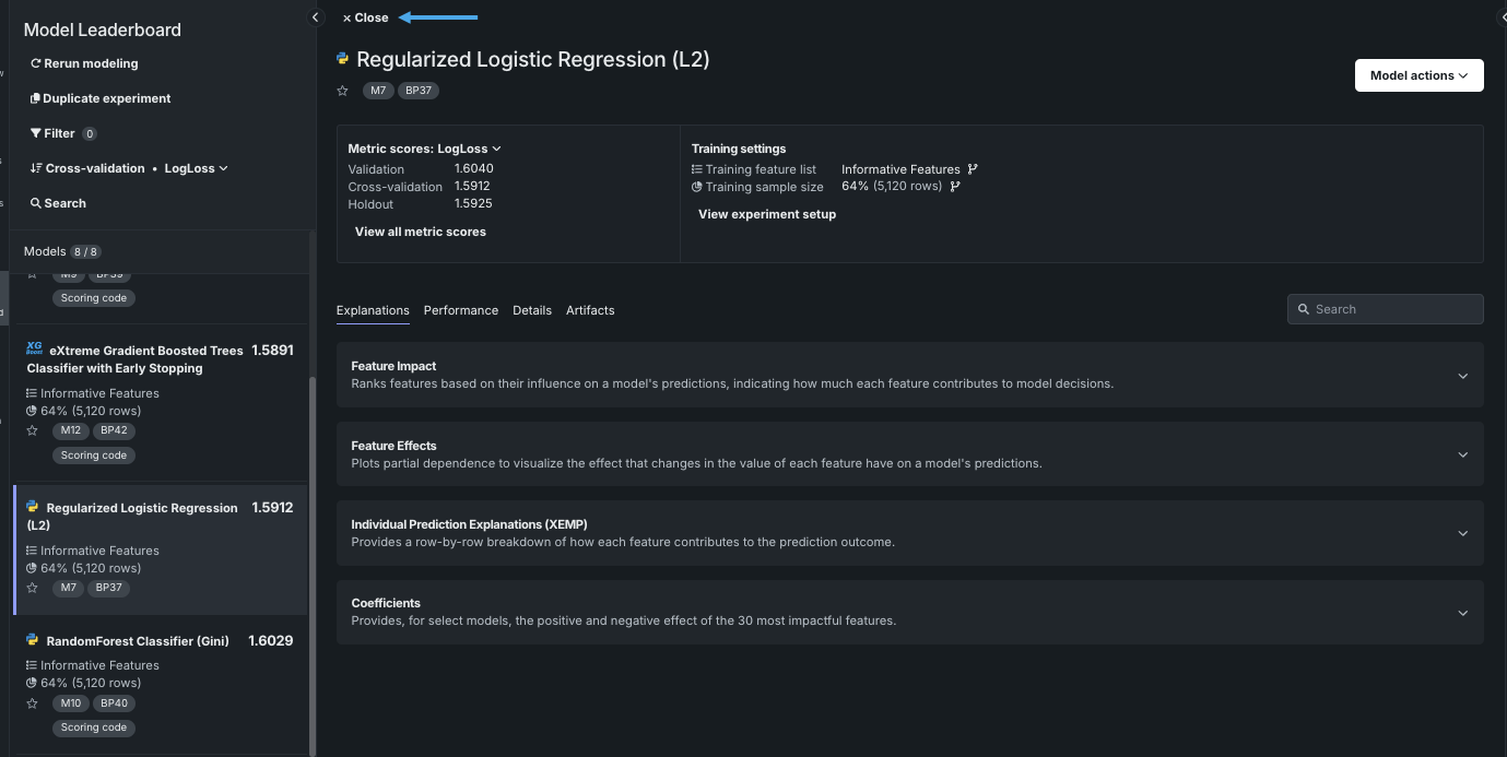 Click any model to show additional scoring information and to access the model insights. Click Close to return to the full-width view.
