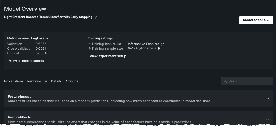 When you select a model from the Leaderboard listing, it opens to the Model Overview where you can: