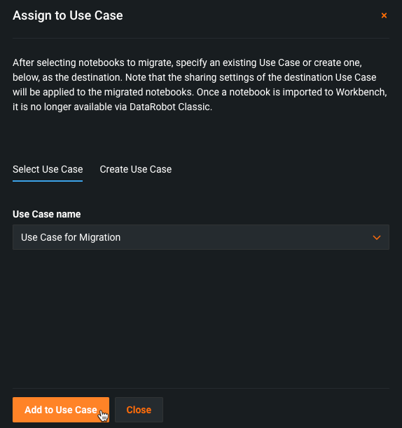 In the proceeding dialog box, choose the Use Case to migrate the notebook(s) to in Workbench. You can select an existing Use Case, or create a new one (for new Use Cases, you must provide a name and description). After selecting a Use Case, click Add to Use Case.