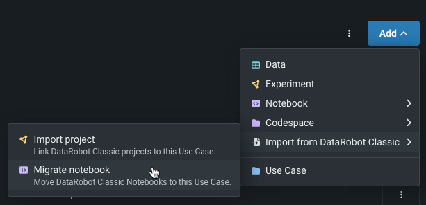 Click Add Experiment > Import from DataRobot Classic > Migrate notebook.